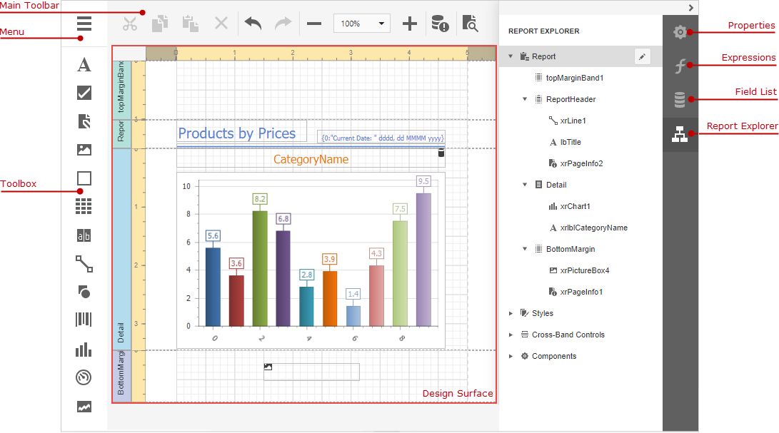 The Design Surface displays a report's structure and contents. You can use the tools on the Report Designer's panels to design the report: