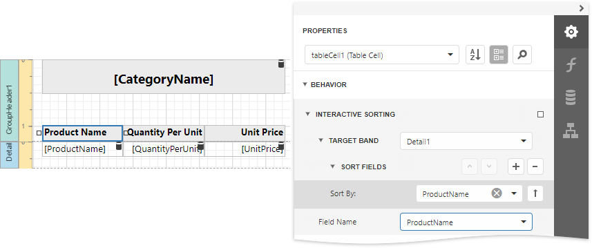 Set the Target Band property to Detail and expand the Sort Fields section and add a new sort field to sort detail data by the product name. Set the table cell's Field Name property to the ProductName field.