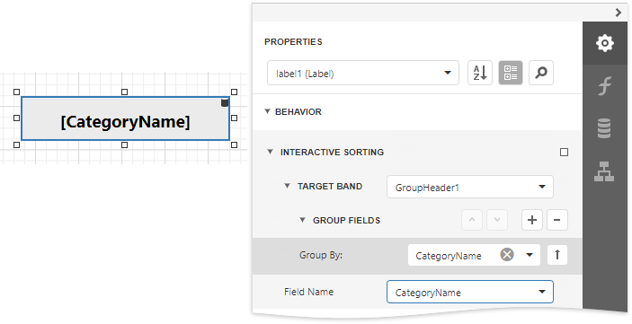 Expand the Behavior category, select the Interactive Sorting section, and set the Target Band property to GroupHeader1. Set the Field Name property to CategoryName.