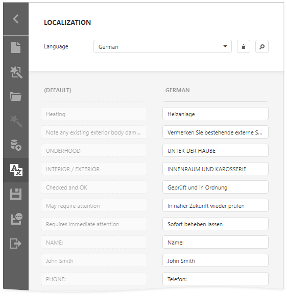 The top panel allows you to change the report's language, add a new language to start localization or delete a language.