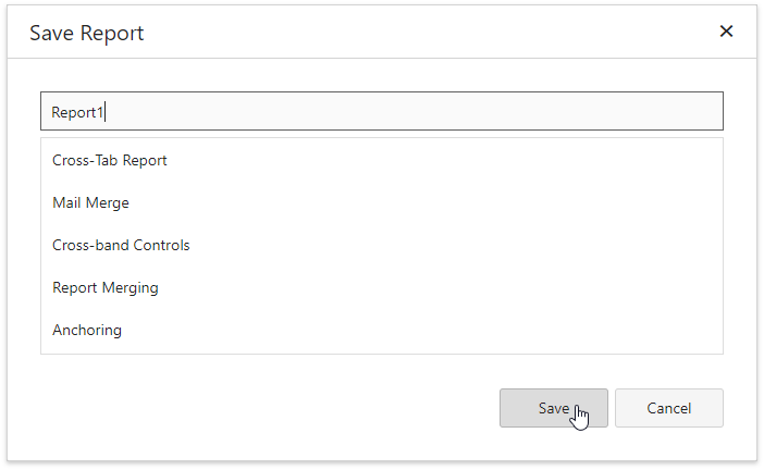 Save Reports Click Save| Save As in the menu to save the current report. Specify the report name in the invoked Save Report dialog. You can see the following message at the bottom of the Designer, if the report is saved successfully.