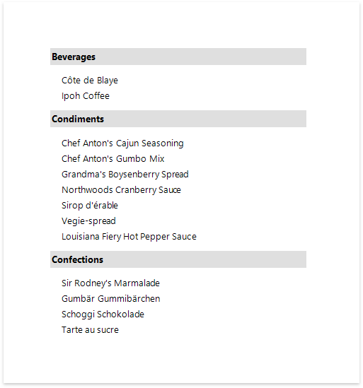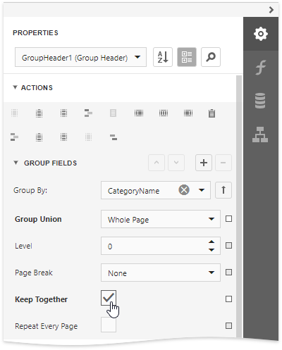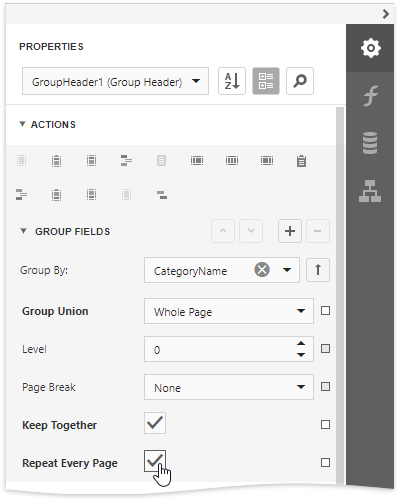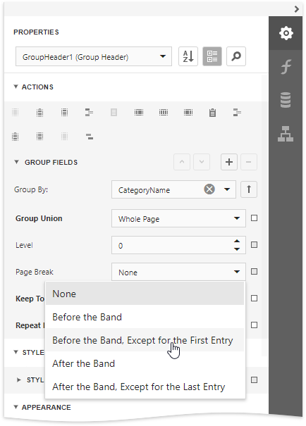 Insert the Group Header band, select the Group Fields section in the Actions category and add a new group field to group the report's data by the required data field.