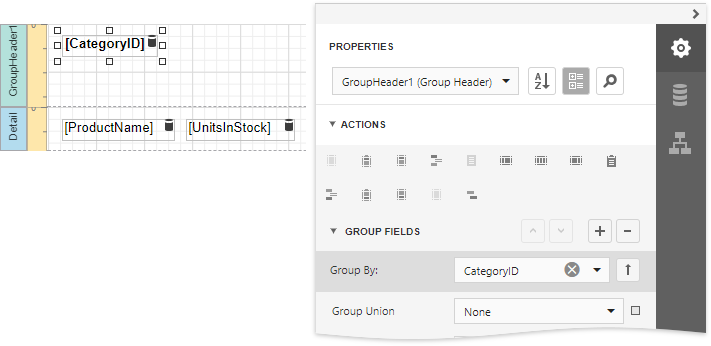 Insert the Group Header band, select the Group Fields section in the Actions category and add a new group field to group the report's data by the required field.
