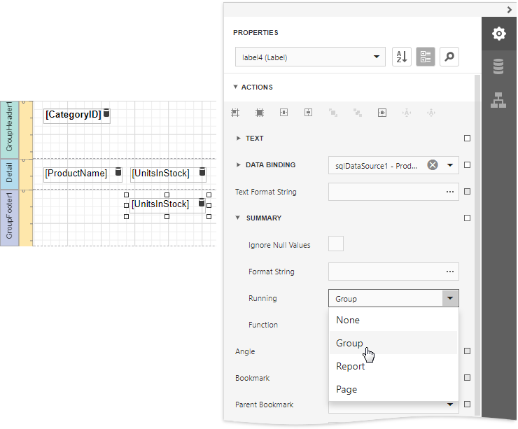 Select the label, expand the Summary section in the Actions category and invoke the Running drop-down list. Select the range for which to calculate a summary (the entire report, a specific report group or document page).