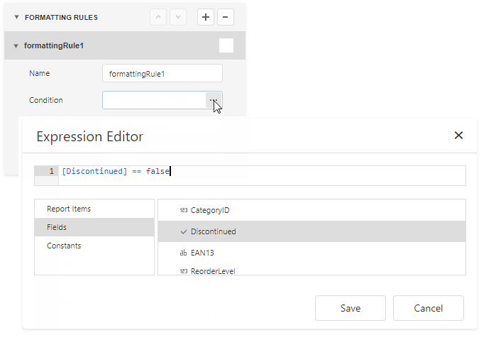 Here, the [Discontinued] == false expression is set for the formattingRule1 and the [Discontinued] == true expression - for the formattingRule2.