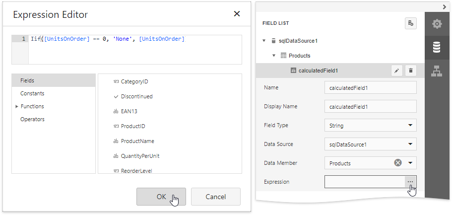 Click the Edit button and set the Field Type property to String. Then, click the Expression property's ellipsis button and define the required condition for the calculated field in the invoked Expression Editor.