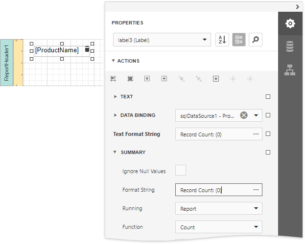Expand the Actions category and insert a Report Header or Footer to display the record count for the entire report.