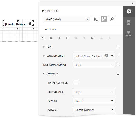 Select the label and expand the Summary section in the Actions category and specify the Running property. Select Report to increment the row numbers throughout the entire report, or select Group or Page to reset the row numbers for every group or page.