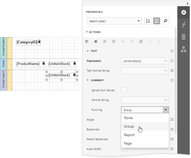 Select the label, expand the Summary section and invoke the Running drop-down list. Select the range for which to calculate a summary (the entire report, a specific report group or document page).