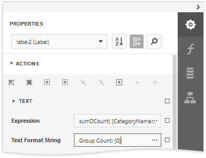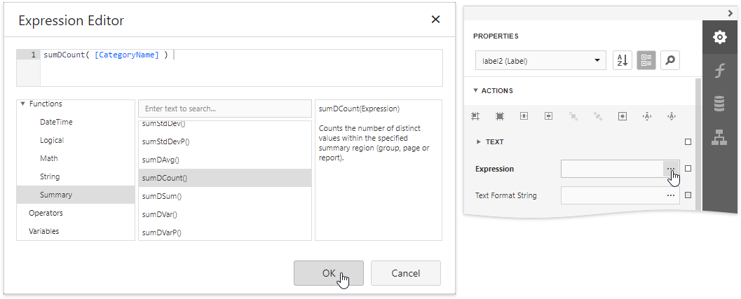 Click the ellipsis button for the label's Expression property. In the invoked Expression Editor, select the sumDCount summary function in the Functions | Summary section.