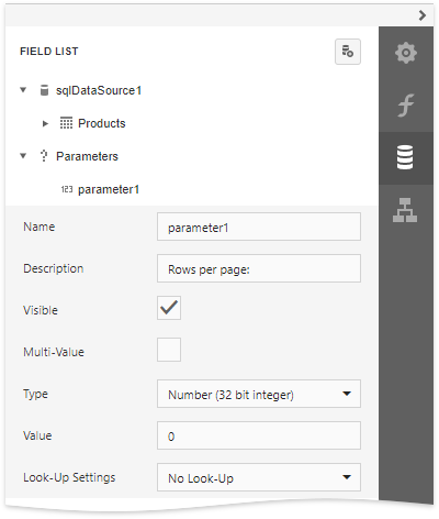 Switch to the Field List panel, select the Parameters node and click Add parameter to add a new report parameter.