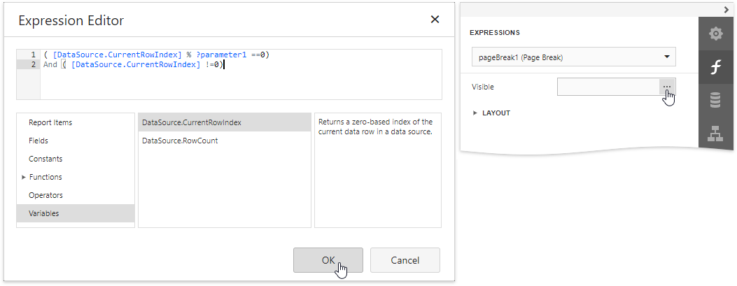 Switch to the Expressions panel and click the Visible property's ellipsis button. In the invoked Expression Editor, specify the required expression.