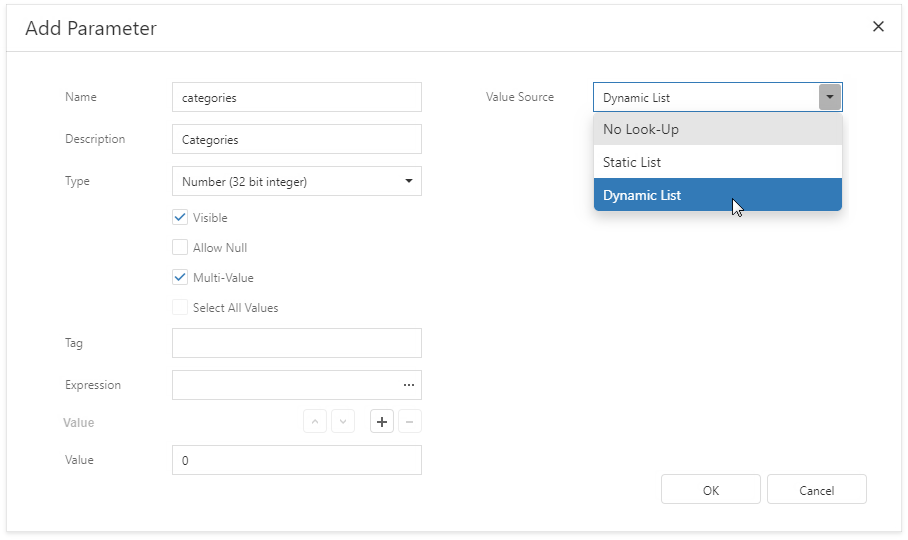 Specify a Data Source and Data Member for the parameter values storage. Value Member defines a data field that fetches values to the parameter. Display Member defines a data field that stores values displayed in the Parameters panel.