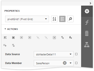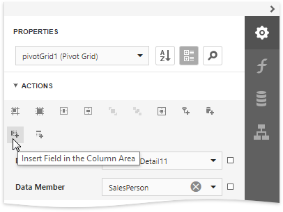 Insert fields in the Filter, Data, Column and Row areas to define the Pivot Grid's layout. Select the corresponding command in the Actions category.